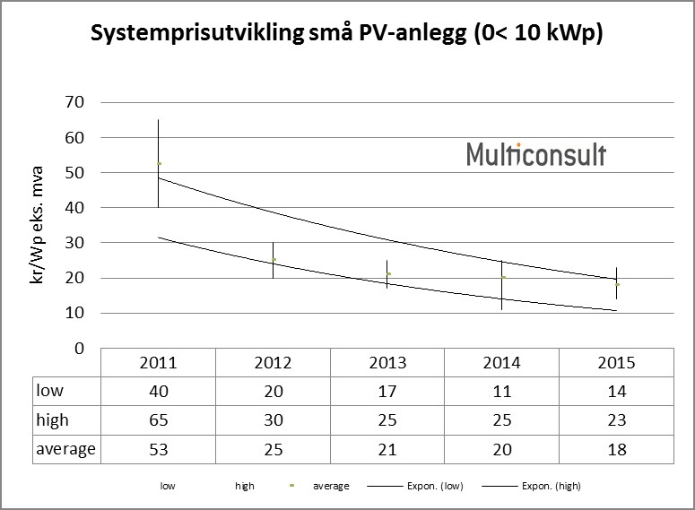 Kostnadene for solcellemoduler og tilhørende systemkomponenter har i Norge sunket med prisutviklingen internasjonalt. Dette bildet reflekteres i mindre grad i norske systempriser, noe som i vesentlig grad er forårsaket av at markedsvolumet må kunne kalles beskjedent.