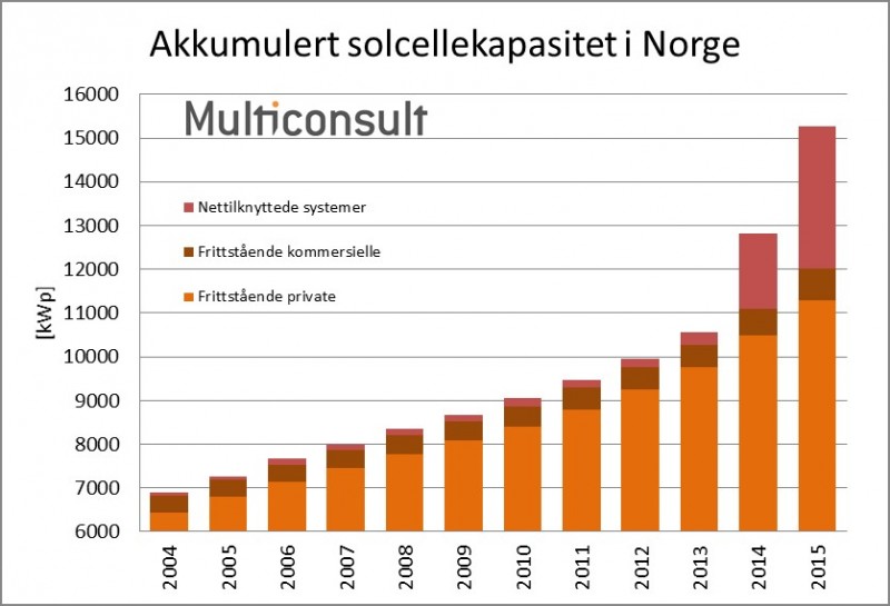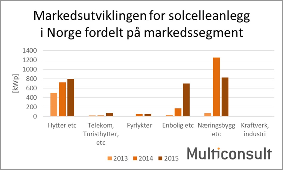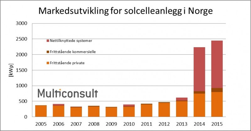 I 2015 ble det installert totalt 2,45 MWp solceller i Norge, som betyr en vekst på 10 prosent i forhold til 2014. Det er nett-tilknyttede solcelleanlegg som utgjør hoveddelen av det totale markedsvolumet.