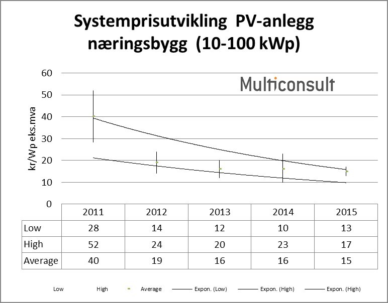Gjennomsnittlig systempris for større anlegg til næringsbygg viser ca. 5 prosent reduksjon i forhold til 2014