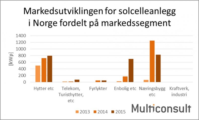 Den viktigste endringen ser man i utviklingen av boligmarkedet. I dette segmentet ble det installert fire ganger mer solceller i 2015 i forhold til i 2014. Av det totale markedsvolumet på 700 kWp i dette segmentet ble 319 kWp finansiert gjennom støtteordningen «Enovatilskuddet» som ble lansert i januar 2015.